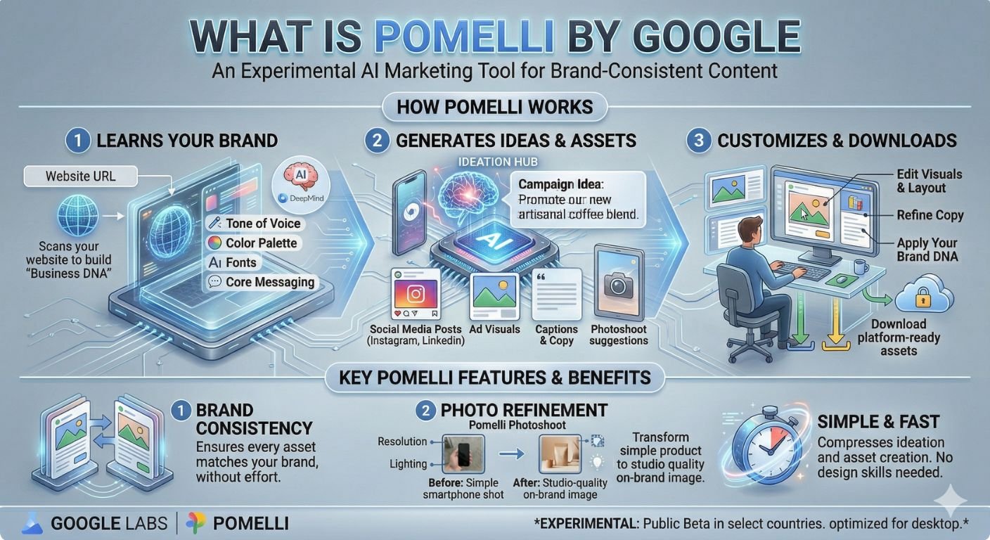 Artificial Intelligence is evolving rapidly, and Google continues to lead with innovation. After the success of Gemini, Google has introduced Pomelli, a powerful AI tool designed to simplify how we work, create, and think. Whether you are a marketer, content creator, business owner, or student, Pomelli aims to become your everyday productivity partner.In this blog, let’s understand what Pomelli is, why it matters, and how it can transform your daily workflow.